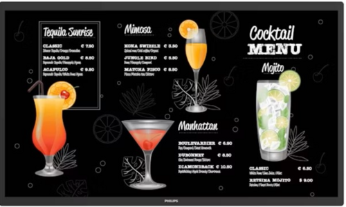 The e-paper displays from Philips are impressive not only from a technical standpoint, but also visually. With their frameless, modern design, they blend seamlessly into any environment – whether in a sales area, restaurant or reception area. Different size options allow for flexible use depending on your needs, and of course the displays can be used in both portrait and landscape format. Thanks to their contemporary aesthetics, they emphasise the professional appearance of any location and visibly enhance the atmosphere of the room. The slim design also ensures that the displays can be easily integrated even in confined spaces. With this special combination of elegance and functionality, Philips Tableaux displays set new standards in the field of digital presentation solutions.